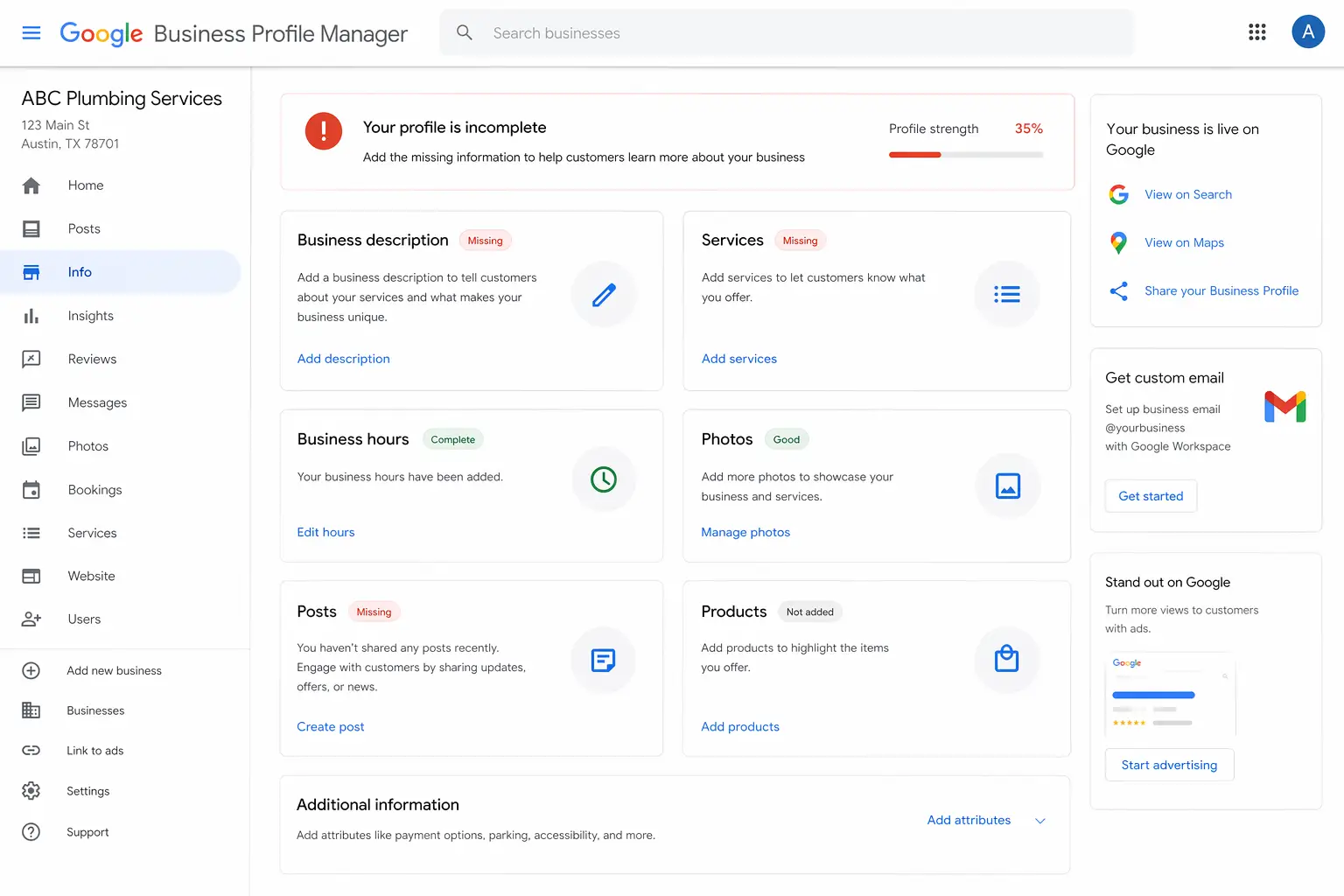 | Website and profile exist | Missing categories, services, posts, and responses |
