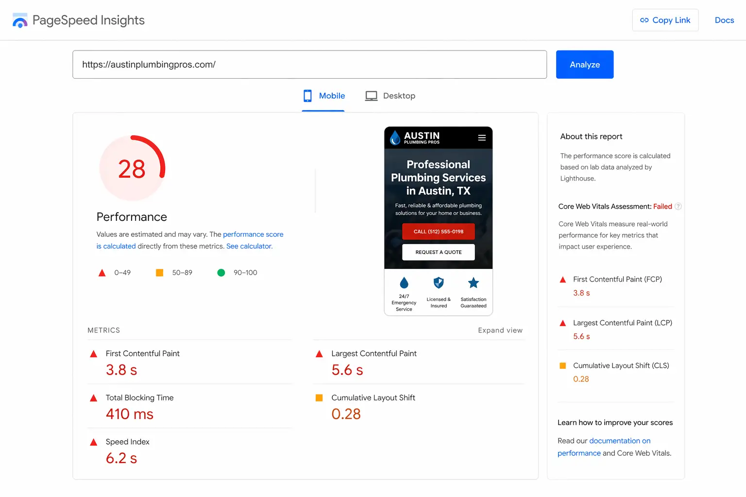 - Core Web Vitals: What is the PageSpeed score on mobile? What are the LCP, CLS, and INP scores? Is the site passing or failing?